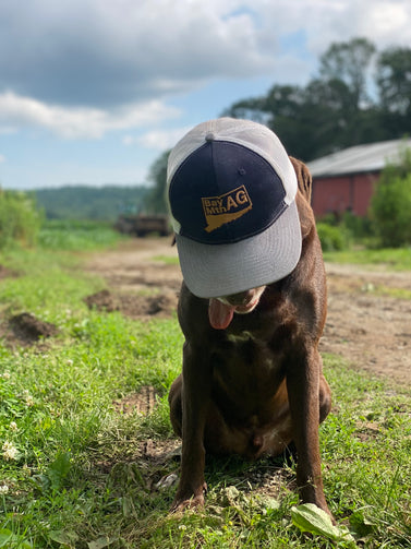 Perfect for Men, Women, dogs and anyone else who lives under the sun. The Bay Mountain Ag logo is inscribed in the State of Connecticut, showing our pride to be grown and manufactured in Eastern Connecticut. The logo is embroidered with tan/brown thread on a blue port authority trucker's hat with a gray bill.